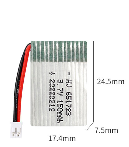 The 3.7V 150mAh 651723 PH2.0 plug is suitable for JJRC H36, NIHUI NH010 aircraft, and other similar products.
