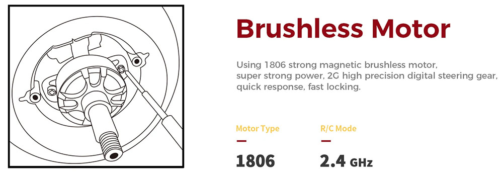 2 1806 strong magnetic brushless motor, super strong power. 2g high precision digital servo, quick response, fast lock. 3.