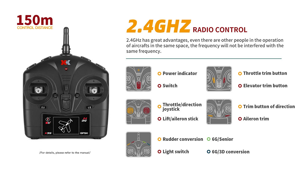 4 The airplane adopts 6-axis gyroscope, attitude locking, 3D/6G mode conversion, suitable for different scenarios of flying. Air mode conversion, more both beginner mode and aerobatic mode. Wind blades, motors and wings are detachable for easy replacement.