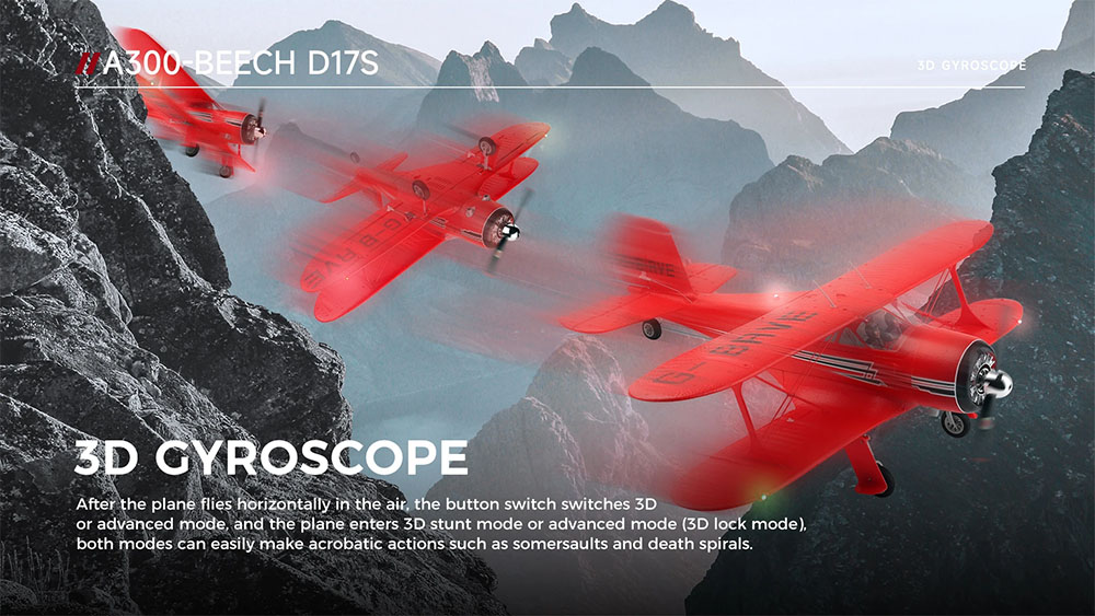 (2) outdoor aerobatic mode: after the airplane is flying horizontally in the air, the button switch to switch 3D or advanced mode, the airplane enters 3D aerobatic or advanced mode (3D lock mode), both modes can easily do somersaults, death spirals and other aerobatic maneuvers.