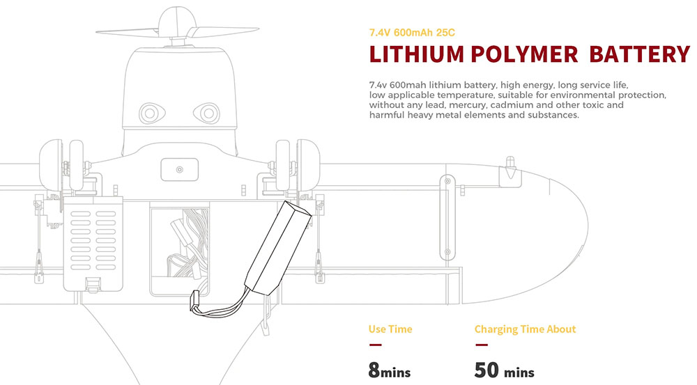 8. high capacity large multiplier 7.4V 600mAh 25C lithium polymer battery, gliding flight time about 8 minutes or so.